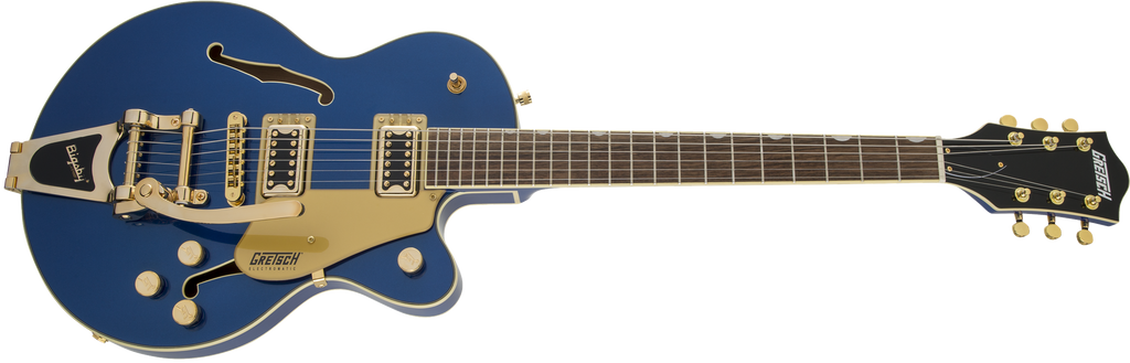 The G5655TG Electromatic Center Block Jr. Single-Cut combines classic Gretsch power with a lightweight, smaller body featuring a chambered spruce center block for rich resonance and high-gain tone. It offers smooth playability with a 12"-radius laurel fingerboard, 22 medium jumbo frets, and NeoClassic™ thumbnail inlays. Equipped with dual Black Top Broad’Tron™ humbuckers, Bigsby® vibrato, and gold hardware, this guitar delivers dynamic sound and stylish performance in a striking Azure Metallic finish. Perfect for players seeking authentic Gretsch tone and comfort.