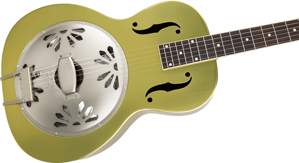 Add vibrant character to your music with the G9202 Honey Dipper Special resonator guitar. Featuring a Bell brass metal body and a hand-spun Ampli-Sonic aluminum cone, it delivers rich, powerful tone and volume. The mahogany neck with medium “V” profile and the hard maple biscuit bridge with ebony and maple saddle ensure comfortable playability and excellent sound transfer. Finished with aged white fingerboard binding, a screened headstock graphic, and a weathered "Bell Bronze" look, this limited-release guitar combines classic style with standout performance.
